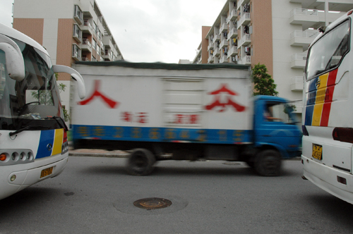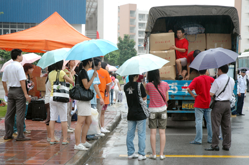 8点,客车和货车陆续抵达。当天的搬迁队伍共调用货车14台,分两批,共28车次,客车12台,分两批,共24车次,务求高效顺利地完成搬迁工作。8点半,一场暴雨不期而至,正在热火朝天进行搬迁的学生不得不放缓脚步。