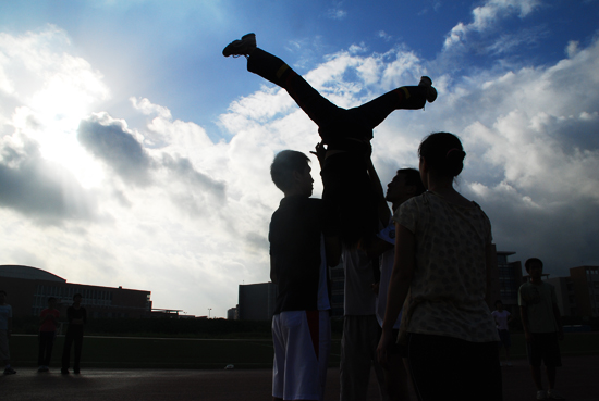 据悉,代表学校参加开幕式表演的这两个方块从5月31号开始排练,其中除了校健美操队和跆拳道弘道馆,还有来自南校区各个学院选修健美操和跆拳道的同学。由于天气炎热,考虑到队员们防暑需要,因此露天训练时间一般安排在早上和晚上。