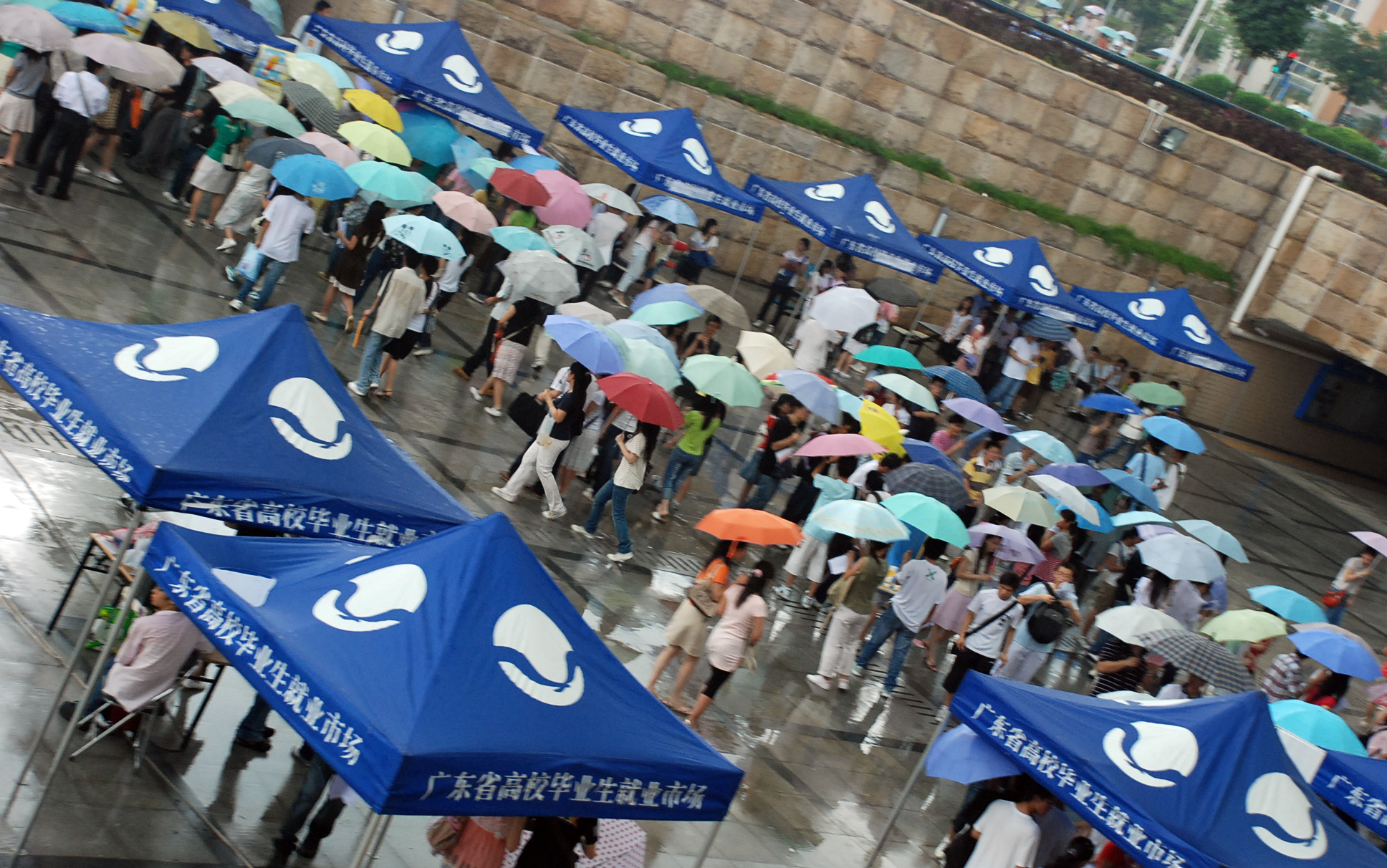 中途暴雨来袭,应聘者纷纷撑起雨伞