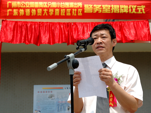仪式上,小谷围派出所教导员郑伟发表讲话。他在发言中感谢了省公安厅、市公安局以及广外对社区警务室建设的大力支持和积极配合。他坚信此次警务室的成立一定能够充分发挥作用,保证广外南校区社区的安全和稳定。同时,他还表示,下一步,社区民警将把警力完全下放到社区,让广外的同学们享有更多的安全保障。