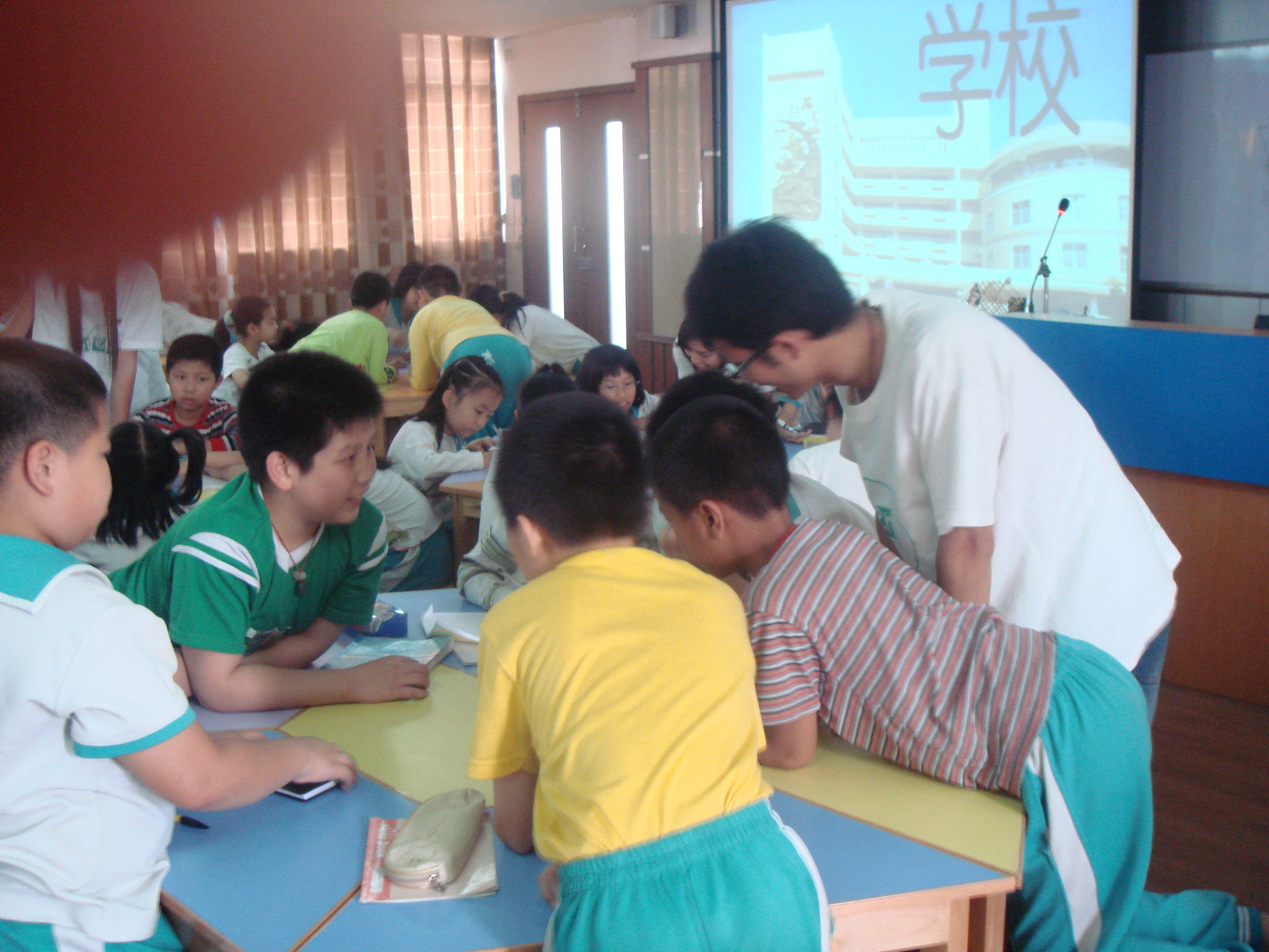 环保教育从下午2点30分开始,历时80分钟共2个课时。干事们分成2组,从该校4年级跟6年级各选了一个班来进行上课。上课铃声响起,教员首先做自我介绍,一句亲切的“我是东东姐姐”很快就拉近了师生之间的距离。接着教员们把学生分成6个小组,进行环保知识问答竞赛和玩游戏,在游戏的过程中进行知识的传授和讲解,寓教于乐,相得益彰;既达到了环保宣传的目的,又能调动学生上课的积极性。