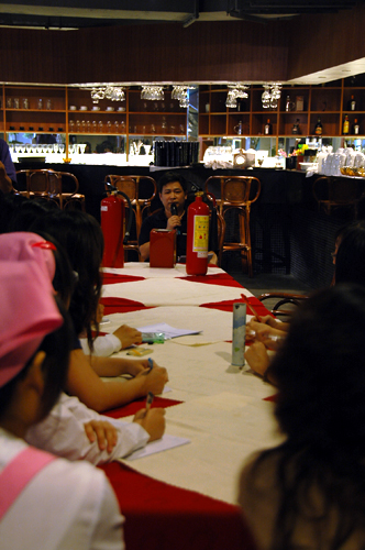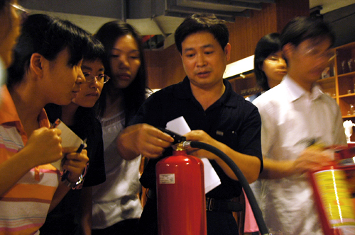 接着,校保卫处的黄老师向员工们介绍了国家对公共场所消防安全处理条例和程序、如何防范火灾事故的发生,以及在发生火灾时如何疏散人员安全逃生等问题。由于水榭咖啡屋位于地下一层,防火安全犹为重要。黄老师介绍了防火四法“冷却、隔离、窒息、抑制”和应遵循“报警早、信息清楚、边报边灭、先救人再救物”等法则。接着,黄老师向大家传授自救与逃生的方法:一旦遇上火灾,不要躲在别人发现不了的地方,要弯腰低头、将湿毛巾或衣物捂住鼻口逃离现场。此外,黄老师还两次向同学们演示如何使用ABC式干粉灭火器和泡沫灭火器。最后,黄老师强调,防范胜于救灾,自觉从现在、从自我做起,做好消防安全工作,才能确保广大师生的安全。