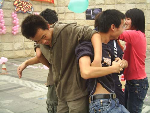 这个游戏需要四个人背靠背、手反扣手,夹着一个气球跑完一段路程。游戏讲究的是团结,如果有同学落后,大家也要拉着他以一个团体的形式坚持到最后。