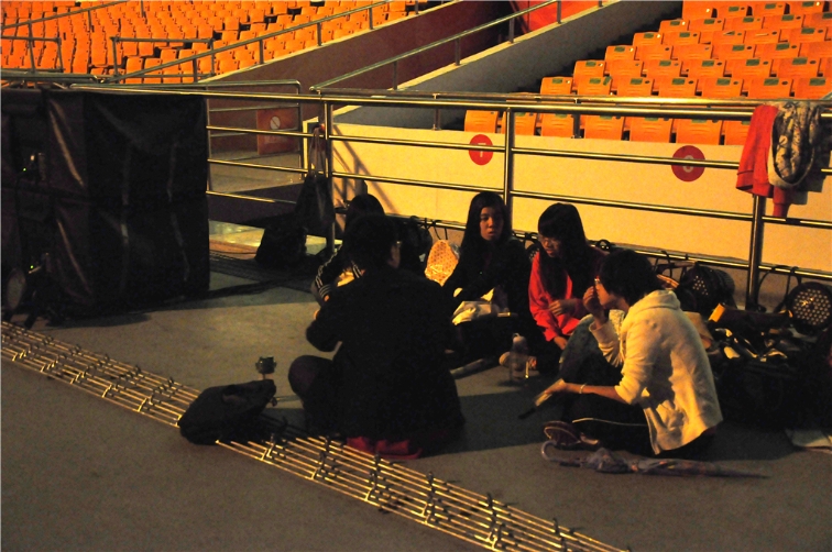 然而,在场地的另一边,有四个后备演员不能上场彩排,只能安静的坐在一旁等待着。广外亚运会闭幕式表演团队的负责人国际经济贸易学院的陈健老师随即过来和她们聊天。从学业上的困惑、学业和社团活动的平衡到地方民俗、网购等各个方面,无所不谈,和四个演员一起消磨略带枯燥的等待时间。同时,陈健也向相关负责人建议让四个后备演员有上场彩排的机会,这样一来既能让四个演员不会每次都只是枯等,同时也能更好的应对突发状况。