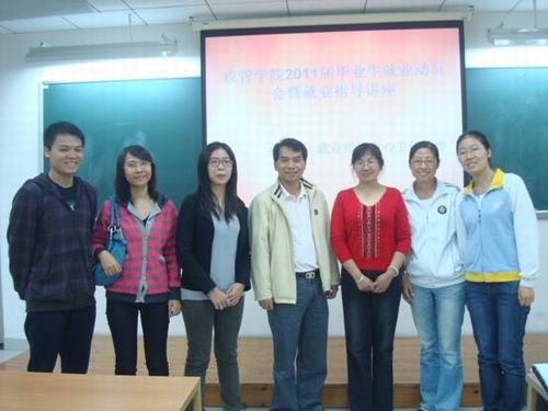 政管学院党委副书记麦培年、2011届毕业生辅导员梁玲华、教务员李洁、郭洪龙等出席了本次讲座。本次动员大会旨在对2011届毕业生的就业工作进行动员部署,帮助政管学院本科生了解当前的就业形势,转变就业观念,提升同学们的择业技巧和就业能力。