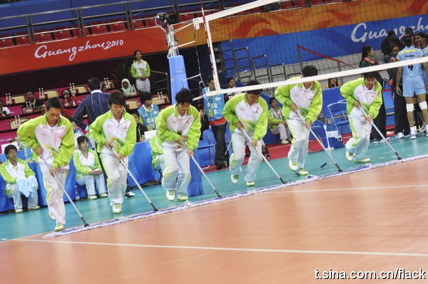 本网讯 自亚运会女排开赛以来,在惊叹王一梅的重扣时,你是否留意过场上捡球的绿色身影?在观赏球场上的激战时,你是否发现坐在角落仔细擦着球的绿色身影?在听到暂停哨声吹响时,你是否注视过场地上迅速擦地的绿色身影?