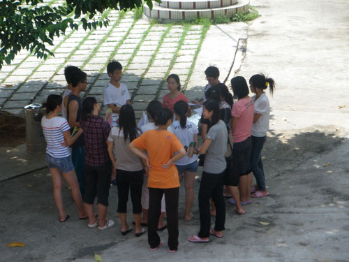 踏着初升的太阳,从宿舍到学校约莫20分钟的路程,沿途经过市场、稻田、村落,终于到达小学所在地,让我们对当地情况有大致认识。队伍刚到大岗镇中心小学的校门,便受到李校长和罗主任的热情欢迎,两位老师对我们的到来感到喜悦与激动。随后一行人在校长办公室交谈,席间“梦之筑”队长包莹莹以及部分队员积极向李校长和罗主任提问。由于校方的积极认真配合,我们的问题很快就得到解决,例如课室、午餐、教学设施、上课时间、学生安全问题等等。期中李校长特别强调学生安全问题,由于暑假时间,学生管制力度降低,容易安全意外。因此校长特别指出我们要开办专门课堂教授安全知识,提高学生安全意识,比做好一系列安全措施,例如上课关闭校门、成立以村为单位的路队回家。我队表示在教好小朋友每一堂课之余,还会做好学生安全工作,让学生平安快乐享受英语义教之旅。