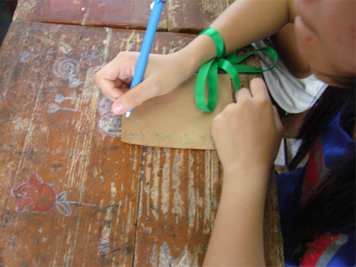 新丰二中的学生认真地在愿望纸条上写下自己对本次下乡服务的期望