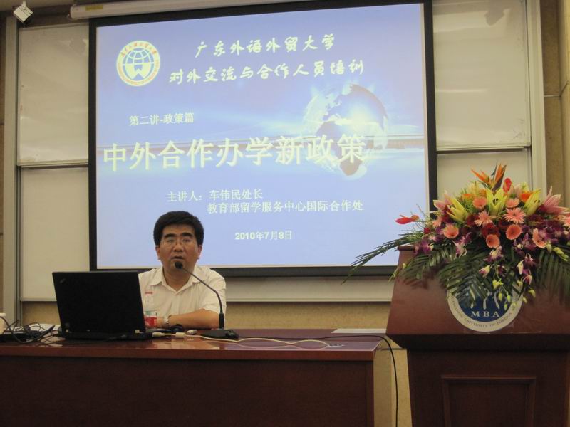 本网讯 2010年7月8日下午,伟德bv国际体育,BETVICTOR官网对外交流与合作人员培训第二讲——“政策篇”在MBA中心黄华讲堂举行。教育部中国留学服务中心国际交流处处长车伟民受邀为伟德bv国际体育相关部处、各二级学院负责人以及相关国际项目负责人做了关于“中外合作办学新政策”的讲座。副校长方凡泉代表学校向车伟民赠送了纪念品。