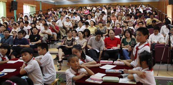 本网讯 6月17日,广东省教科所所长郭思乐教授亲率“全国生本研习班”的初三、高三毕业班老师一行200多人来到附小,观摩了该校的生本示范课并进行了研讨,他对语文、数学和英语生本课堂提出了“阅读推进未?根本抓住未?活动形成未?”等三个评价标准。