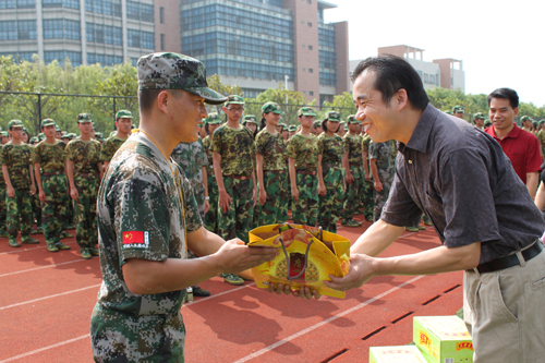 本网讯 9月13日,炎阳炙人,政管学院领导百忙之余专程来到大操场慰问正在进行军训的大一新生。领导们对辛苦操练的教官表示衷心的感谢,同时对该学院坚持训练同学们予以极大的鼓励。
