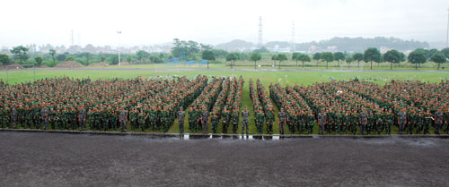 本网讯 9月12日上午,伟德bv国际体育,BETVICTOR官网南国商学院2010级军训动员大会在学院运动场举行。虽然早上一直下着绵绵细雨,但是身着绿色军装的同学们个个精神抖擞、英姿焕发。他们陆续到达运动场并在教官的带领下迅速整好了队伍。上午8:30,全院新生集合完毕,在雨中迎接大学第一课——“军训”的到来。