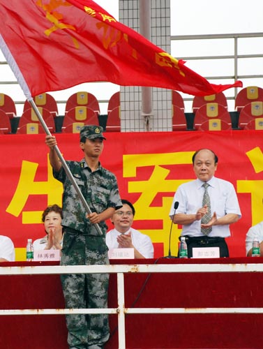 奏唱国歌完毕后,彭志芳宣布2010级新生军训正式开始,并向军训团授旗。