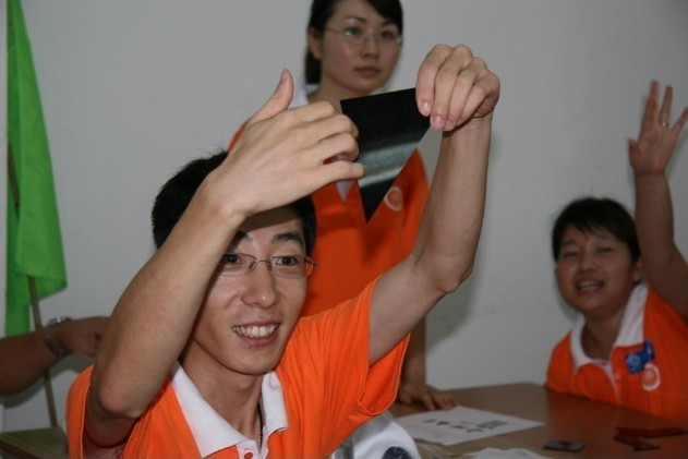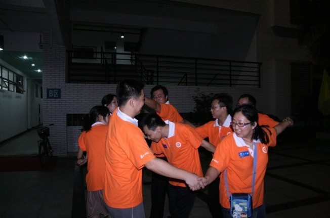 “乡音接龙”、“齐心协力”、“解手结”……活动的进行逐渐消除了团队新成员们之间的隔阂和拘束,很快打破了相互之间的冰封状态,拉近了彼此之间的距离。教练们还启发式地带领同学们一起探讨如何构建学习型团队,让同学们体会到集体智慧和团队力量的强大。其中,第二组教练李耀坤用双语组织拓展活动,使外国留学生队员尽快融入团队。