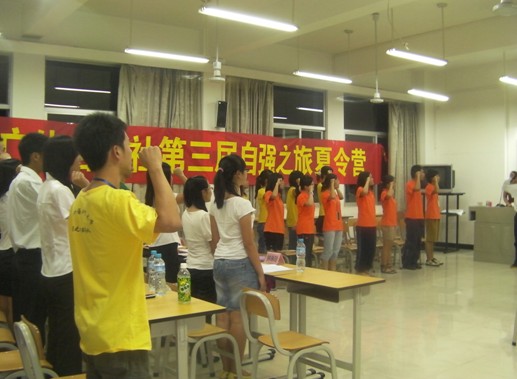 本网讯 为给第六届新干部们提供锻炼提升的平台,奠定新一届自强之基,打造自强社的核心团队,广外自强社举办了第三届自强之旅夏令营。8月31日晚,开营仪式在南校区教学楼A栋201举行。参加此次夏令营开营仪式的有勤工助学中心常务副主任钟琳玲,学生咨询中心主任余裕峰,勤工助学中心老师卢绮文,05级师兄雷清锋以及全体夏令营营员。