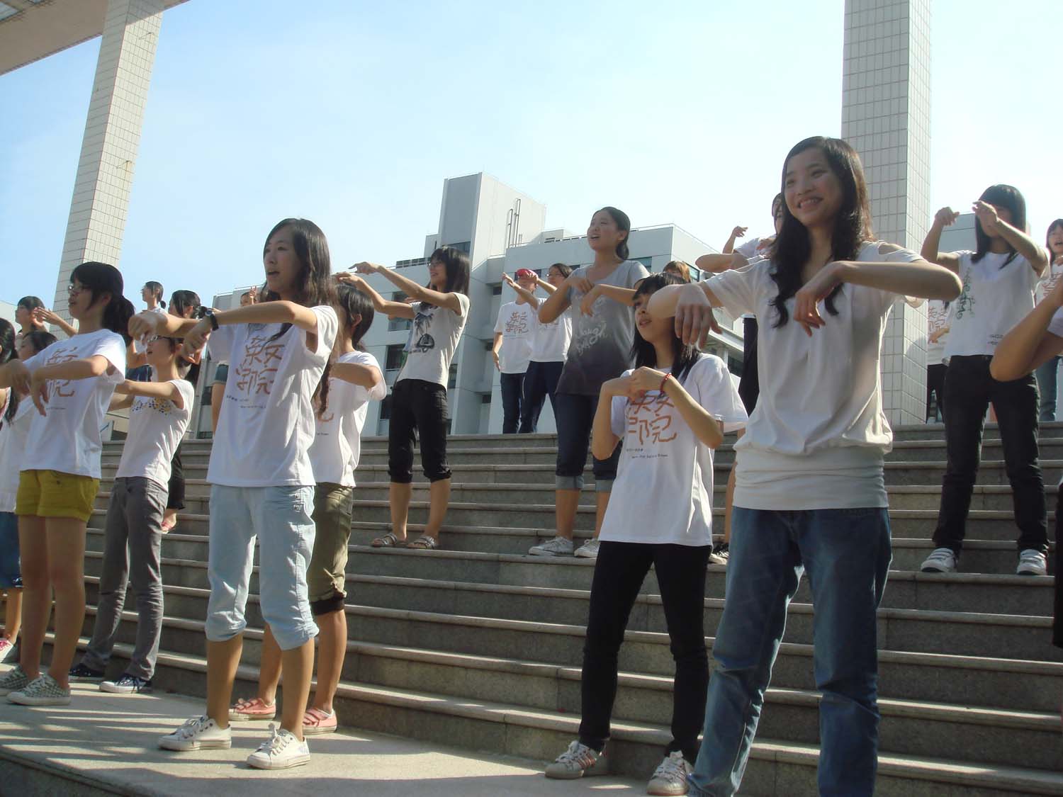 表演过后,全校的歌舞秀引发了全场的高潮。伟德bv国际体育的教员们们站在阶梯上认真地领舞,台下的学生们也尽情地舞动,沉浸在节奏强烈的舞蹈中。《Donkey》,《how are you》,《Barbie girl》等一首首英文歌在全场学生的舞动下,焕发了新的活力。