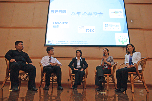 随后评委上台与选手及观众分享了大公司招聘时需要的能力,赵颖认为学习能力很重要,专业知识不能丢,要学会平衡各种利弊;李春燕则表示找到一份合适自己的工作,有必要知道自己的能力、素质与性格等方面是否与公司文化契合。对于现在大学生的新特点谭竟聪表示现在的大学生创新能力与商业化能力提高了,苏登光同意谭竟聪的看法,并补充到“80后”特别是“85后”独立性也提高了。在最后的交流环节中,在场同学积极提问,互动气氛火热。