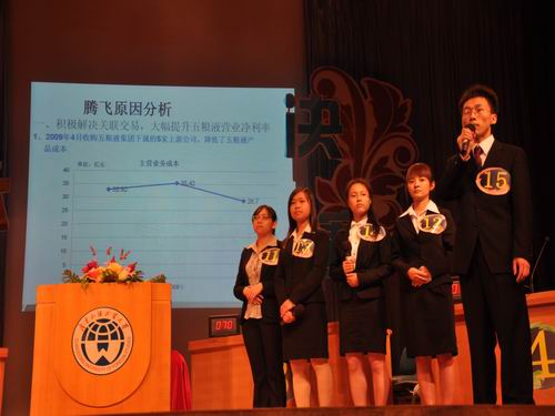 决赛分为现场展示和知识竞赛两个环节。在现场展示环节中,各队选手要在规定的时间内进行陈述案例、分析演讲,展示各自的集体智慧和专业风采,回答现场评委提问。一号One Piece对五粮液集团的财务报告进行了分析,重点论述了金融危机背景下,五粮液业绩飞升的各种因素,结合图表分析和有力的论据探讨了公司业绩快速发展的原因;二号Edifier则根据延边公路04年的财务状况来论述“延边公路为何称为理想的空壳”;三号潜水艇选择美的电器作为案例,深入分析了该公司并购融资和国家政策拉动对其业绩的影响;最后出场的四号结合长安汽车的实际经营状况,对其长期偿债能力、营运能力、盈利能力和综合能力进行了深入的分析,出色地回答了评委对汽车销售毛利率提高等问题的提问,赢得热烈的掌声。