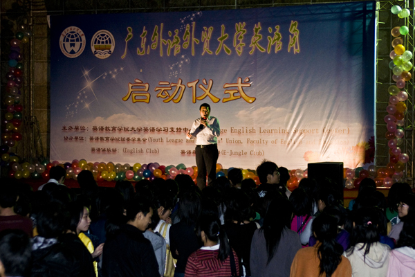 本网讯 4月22日晚7时30分,广外英语角启动仪式在微风细雨中进行。此次启动仪式在南校区隧道口广场展开,由英语教育学院大学英语学习支持中心、英语森林俱乐部、英语俱乐部、英语教育学院团委和学生会等联合举办。此次活动吸引了许多热爱英语的师生,包括从各地赶来的外国友人参加。校长仲伟合、教务处处长詹文都、校团委书记刘志军、英语教育学院院长周富强、党委书记袁长青,中文学院院长陈彦辉,政管学院院长彭未名、党委书记范静静,艺术学院党总支书记车小真,继续公开学院院长何勇斌,留学生教育学院院长梁学宏等出席了启动仪式。
