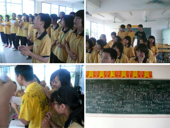 班会结束后,学生不仅要求老师签名,还要求把名字和祝福语签到老师的衣服上,互留祝福。有的班级唱起了偷偷排练好的歌曲《舍不得》,学生们舍不得的情怀真真切切的让老师们的心融化了,变成了泪水。还有学生为即将生日的老师唱了生日歌,送上了小礼物。平时大大咧咧的小女生,酷酷的小男生在此时此刻都隐藏不了不舍之情,一个拥抱久久不能释怀。