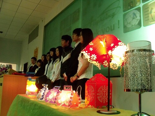 伴随着舒缓的音乐,灯饰变幻着不同色彩。“阿拉丁”灯具有限公司从企业介绍、市场分析、产品介绍、营销策略等方面宣扬主打产品灯具。他们注重低碳生活,强调新健康理念,介绍了如何利用EPL等新技术节省成本。当一台覆盖有团团白色羽毛的灯具被带到舞台前时,奇特的创意霎时吸引了观众的眼球。