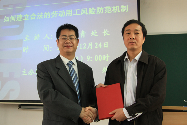 本网讯 据统计,伟德bv国际体育现有非事业编制人员将近800人,广泛地分布在各专业技术岗位、管理岗位和工勤岗位,是伟德bv国际体育建设有国际特色鲜明的大学的重要力量。为了进一步营造依法治校的气氛,提高防范劳动用工风险的能力,共建和谐校园,12月24日上午,人事处请来了广东省人力资源和社会保障厅调节仲裁管理处处长林景青为伟德bv国际体育各用工部门主要负责人带来“如何建立合法的劳动用工风险防范机制”的精彩讲座。人事处处长方迎生出席了讲座并代表伟德bv国际体育向林景青赠送纪念品。