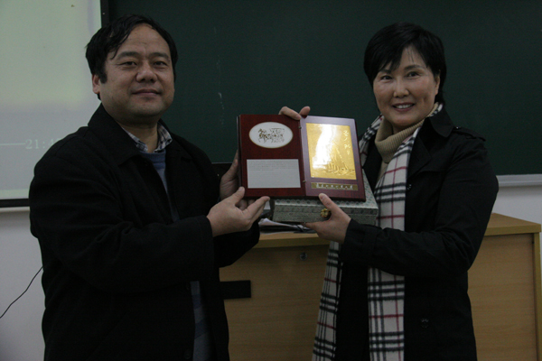 本次讲座由校党委宣传部主办、中文学院承办。党委宣传部部长孔晓明、中文学院教授陈飞,中文学院党委书记蒙德红,副院长陈彦辉、魏慧斌,以及中文学院的老师们作为嘉宾出席了讲坛。陈飞为马志丹颁发中华文化传承与推广研究中心兼职研究员聘书,孔晓明向马志丹赠送纪念品。
