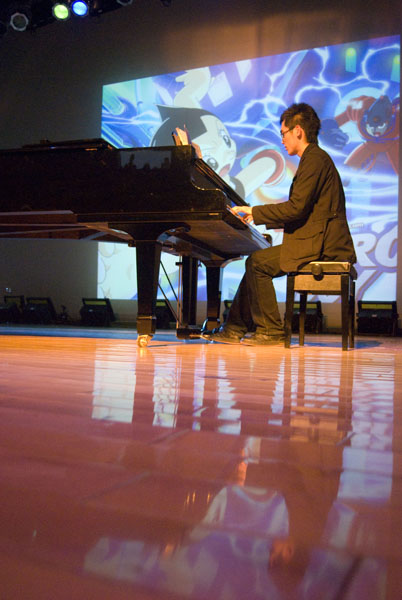 五人劲舞《Nobody》拉开了音乐会的序幕。随着汩汩而至的钢琴声,大屏幕渐渐由暗变亮,一段《Super Mario》(超级马里奥)的游戏视频映入眼帘。当“撞方块”“吃币”“吃蘑菇”“踩乌龟”等这些旧日熟悉的游戏动作再次重现时,全场欢笑声迭起。高先腾双手在琴键上飞舞,欢快跃动的琴音与游戏视频里的角色动作相映成趣。随着王雨溪的加入,流畅动感的双重奏掀起一个小高潮。接下来,高先腾又弹奏了凄美动人的《最终幻想》曲目,古婵君则带来经典FC游戏《功夫》里的背景音乐。美妙的钢琴声勾起观众心中的童年记忆,那些打游戏机的单纯岁月在此刻又逐渐清晰深刻起来。