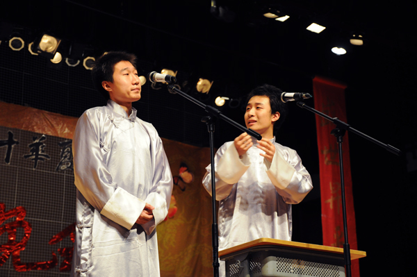 相声节目《大话艺术》则展现孙行和彭晖亚两位笑星的非凡功力,一出场两身银白色的大马褂就引起了观众热烈的欢呼声。两位谐星使出看家本领说笑逗唱,整个晚会的气氛也随着阵阵爆笑声被推向了高潮。节目不仅用幽默诙谐的语言征服了在座观众,其中穿插了精彩的口技表演和舞蹈展示也是一大亮点,如周元动感十足的B-BOX版《龙的传人》和活灵活现的口技二胡,都令台下观众发出阵阵尖叫。孙行在京剧唱段中表现出来的不俗唱功和古怪的反串舞蹈,以及彭亚辉的葫芦丝演奏都为表演增色不少。