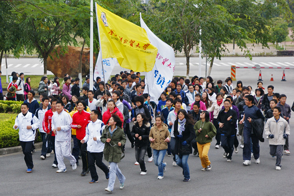 在学生代表雷看向同学们发出“参与冬日长跑,追逐太阳,追逐健康人生”的倡议后,随着仲伟合的一声发令枪响,广外第三届冬季长跑活动正式开始。由仲伟合、林少娜领跑的校运动队、经贸学院、管理学院等十支队伍从田径场出发,途经体育场、学校正门,然后进入语心胡畔,经过院系办公楼、教学楼A座,最后返回田径场。