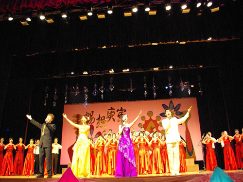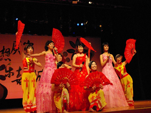 回顾一段2009年的精彩视频后,晚会正式开始。本次晚会分为三大章节。财职院带来的《好运来》拉开了第一章:民族风,中华情的序幕,精彩的歌舞使会场洋溢着喜庆祥和的气氛。