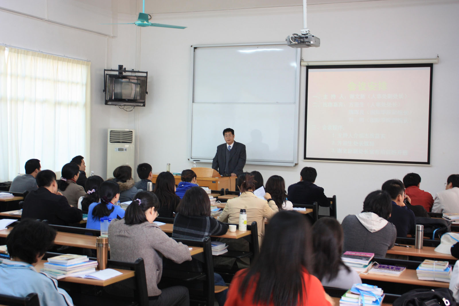 本网讯 11月24日下午,学校资助出国留学教师第1期英语培训班开班仪式在国际学院135教室举行。出席开班仪式的有人事处处长方迎生,国际学院副院长魏辉良、刘明及培训班全体学员,会议由人事处副处长谢文新主持。