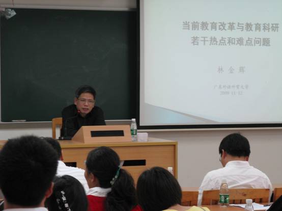 此次科研经验交流会上,学院邀请了厦门大学著名教育学专家、博士生导师林金辉教授做了题为“当前教育改革与教育研究的热点和难点的若干问题”的讲座。林教授旁征博引、宏观全面地分析了目前教育界所关注的热点和难点,即素质教育、大学生创新精神和创新能力、高考和大学教师专业发展等四个问题。关于素质问题,林教授认为素质教育的主要内容应该是思想政治素质、道德素质、科学文化素质、身体素质和心理素质五个方面。关于培养大学生创新精神和创新能力的问题,林教授认为首先应该培养学生的“三基”概念,即基本概念、基本理论、基本方法,“三基”是激发逻辑思维的先决条件。他鼓励大学生以创业带动就业,在创业的过程中发挥自己的创新精神和能力。关于高考问题,林教授认为目前在国内,统一高考时当前社会二元结构和竞争加剧的必然、是维护社会公平、促进社会和谐的必须手段,因此不宜取消统一高考这个相对公平的尺度。关于大学教师发展问题,林教授认为增加投入时前提、体制改革是关键、教学改革是核心。林金辉教授的讲座开阔了教师们的视野、提高了教师们对教育问题的关注度。