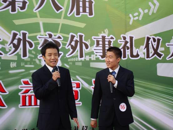 2009年10月31日下午,作为热身赛的第八届全国大学生外交外事礼仪大赛街头公益宣讲活动在国家图书馆广场举行。寒风凛冽中,本校参赛队员孙行、彭晖亚为现场市民献上了一段即兴相声:论语言能力。幽默诙谐而又饱含深意的表演博得了在场评委、兄弟院校参赛队员及市民的阵阵掌声,将现场气氛推向了高潮。