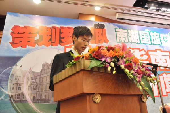 广外94级学生,此次比赛的项目负责人杨一郎代表主委会发表讲话。他表示,“创意”与“激情”是大学生的符号,他们的创意是社会未来发展的最大动力。他认为大学生需要一个平台,将自己的梦想放飞。杨一郎在讲话中强调,当代大学生缺乏的是经验与机会,而不是梦想与创意。因此社会各界应该尽一切的力量来让大学生的梦想落地,践行自己的创意。 最后他表达了自己对大学生的美好祝愿:“放飞梦想,还社会一个奇迹”。