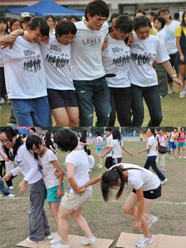 下午,趣味项目走进了大操场。五人六组、抱球跑、五人六足,同学们玩得不亦乐乎。欢笑成为本届院运会的一大特色。