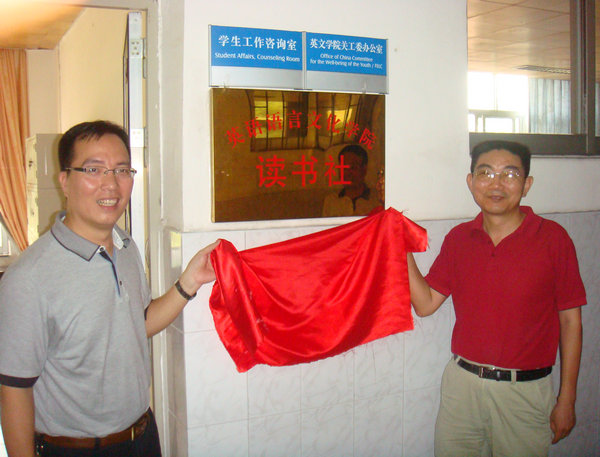 本网讯 10月12日下午4点,英文学院读书社开幕仪式在一教201教室举行。校教务处副处长孙家和、校团委副书记何越晖,英文学院院长刘岩、党委书记何洪亮、党委副书记何伟儒、副院长马建军莅临大会,英文学院团委书记陈怡西、各年级辅导员以及英文学院09级新生出席了这次活动。