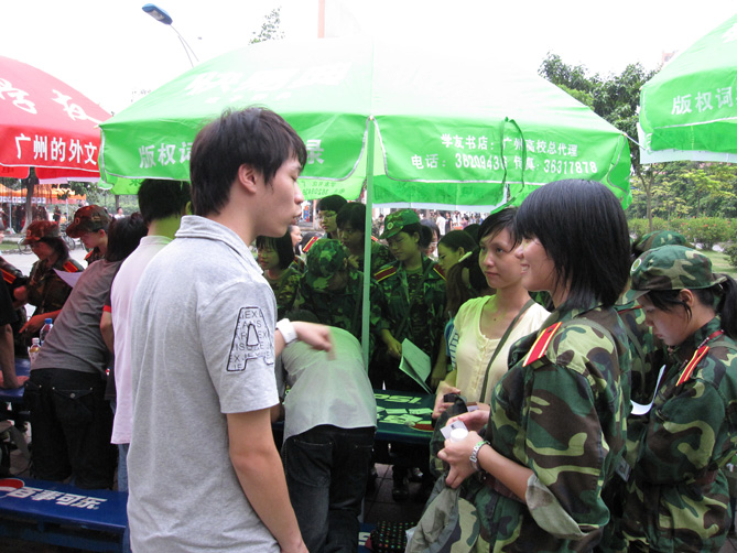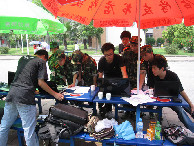 本网讯 9月13日11:30到18:30,蓝色桌椅、数台笔记本、展板、海报一字排开在第三饭堂对面的校道上。3.1声道音响播放着轻快的音乐,穿着军装的新生聚集于信息学院Quanta Center的招新咨询会现场。即使天气炎热,也丝毫不减新生和在场工作人员的热情。