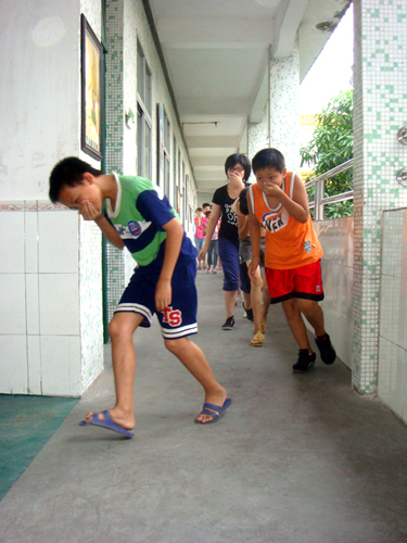 随后,防火防震演练正式开始。当代表地震的第一声铃响起后,各位同学都认真听从老师的指挥,避开横梁等危险处,躲在墙角或是桌子底下,并且用双手保护好头部。15分钟后,代表火灾的第二声铃响起,各位同学在老师的指挥下弯着腰、捂着嘴,有序地从教室撤离到安全地带——操场。队员集合清点人数,并作简要总结。