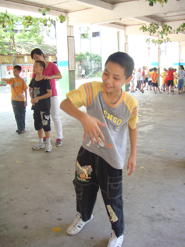 乒乓球的热度与舞蹈课不相上下,这是博爱小学的一大特色,操场上摆放着四台高质量乒乓球桌。球桌后是几个鲜红的大字——“生命在于运动”,这正是博爱小学的体育精神。据悉,这里的学生大都热衷乒乓球,且具备一定水平。课上,老师与学生互磋球技,打起了友谊赛。老师一上场就给了学生一个下马威。只见他侧身、半蹲、抛球,“啪”的一声,一个漂亮的高抛球引起一阵喝彩,让学生佩服不已,纷纷虚心向老师求教。
