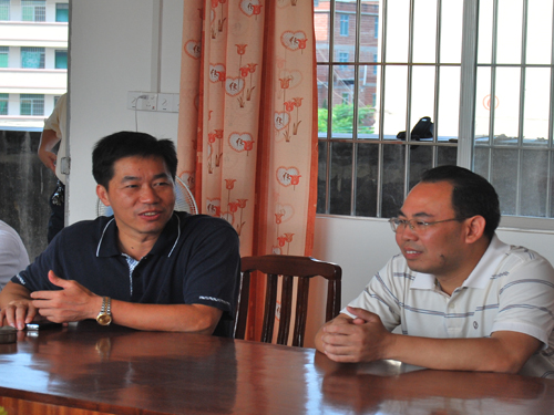本网讯 7月18日,罗定市教育局局长欧泽昌在教育局团委书记邱立仁、素龙中学校长张灿忠、素龙中心小学校长苏全忠的陪同下,对伟德bv国际体育经贸学院“三下乡”罗定服务总队志愿者们进行了亲切的慰问,并与经贸团委书记刘郎及下乡学生代表进行了座谈会。