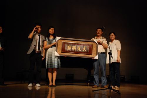 晚会的特邀神秘嘉宾李于昆副院长为大家献上了精彩的笛子演奏《步步高》。随后,毕业生送给学院的书法牌匾“天道酬勤”,车书记上台接受匾额。在同学们的衷心要求下,车小真书记为毕业生们演唱了《隐形的翅膀》这一首歌,这把现场的气氛带入了高潮。