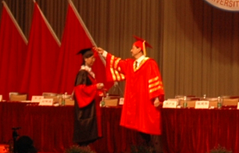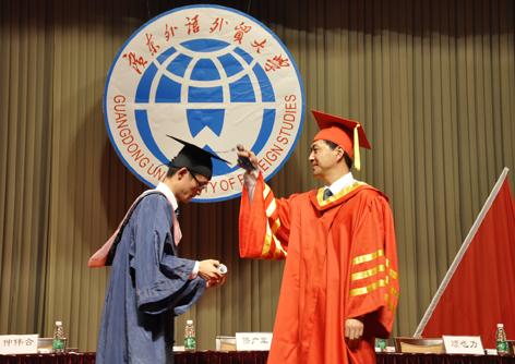 本网讯 凤凰花开,骊歌声起。6月30日上午,2009届研究生毕业典礼暨学位授予仪式在北校区云山会堂隆重举行。来自文科基地、英文、经贸、商英、管理、西语、东语、中文、法学、政管、翻译、词典学等12个研究生培养单位的20名博士研究生、442名硕士研究生毕业生齐聚一堂。