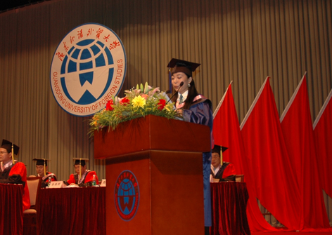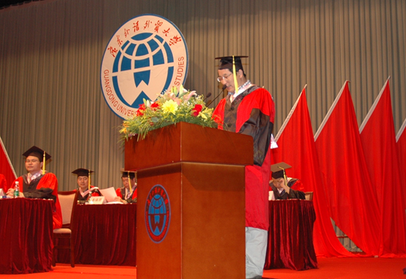 在介绍完主礼教授后,由隋广军致词。他以校长、学长更似一位朋友的口吻道出自己的祝福,更提出了对毕业生们的几点期许:作为有追求的青年,应敢于担当、有所作为,同时脚踏实地、戒骄戒躁,“既要俯察社会,也要仰望星空,以超然的心态,做入世的事业”;作为广外的一分子,应终生学习、善于创新,同时铭记校训,关心母校,不断追求卓越,实现梦想。短短几分钟的讲话,言者谆谆,听者动容。最后,他还特别叮嘱即将启程的学子,祝愿大家旅途平安。