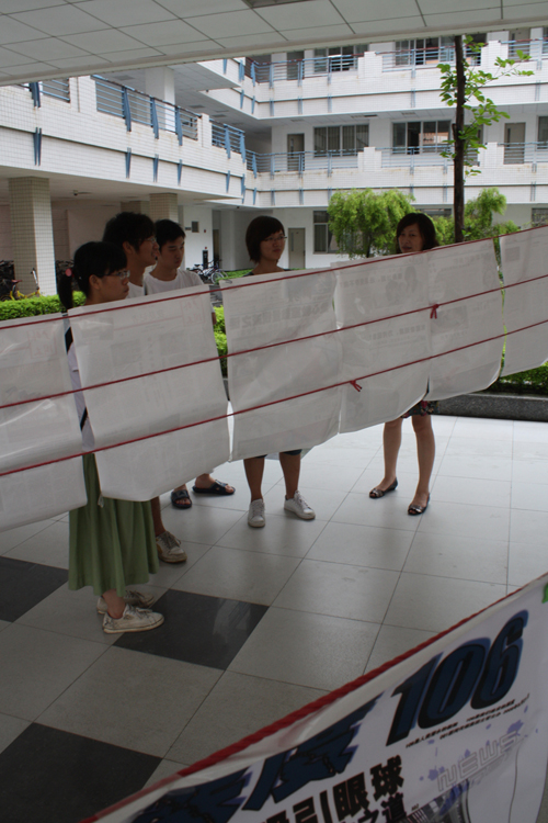 近来路过F栋上课的学生应该会注意到,往常空荡荡的F栋一楼架空层出现了一张张精致的报纸,它们由三根红色尼龙绳串起悬挂在F栋一楼的柱子上。据了解,本次活动是由新闻学院首次举办的08级新新闻人报展,展出的作品是由国际新闻专业08级学生经过一个学期精心制作而成的报刊。
