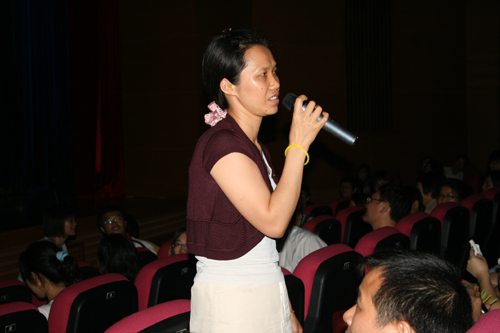 接着,主持人请出曾担任05级辅导员的骆银花为大家讲话。骆银花深情地说:“英文05是一个很棒的集体......英文学院永远是我的家,不论我走到哪里,走到商英也好,离开了广外大也好,英文学院都是我的家。我也希望你们记住,英文学院永远是你们的家,有空常回家看看!”