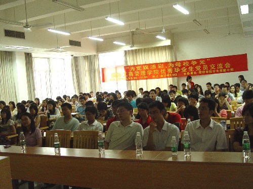 本网讯 5月23日上午,管理学院在教学楼E103举行了“为党旗添彩,为母校争光”优秀毕业生党员交流会,邀请了三位往届优秀毕业生党员与05级学生党员进行交流。管理学院党委副书记朱珍葶,辅导员赵德强、包生耿出席了会议。