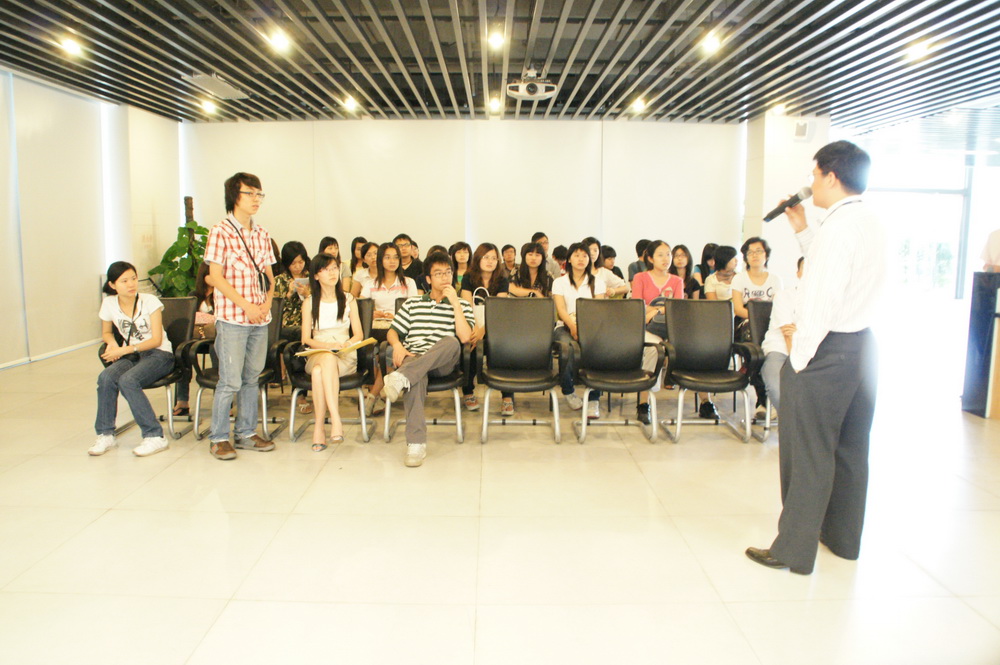其后,师生一行前往位于广州经济开发区的京信通信广州分公司研发基地参观。该企业人力资源总监姜先生为师生们作了一次详尽生动的公司展示,10分钟的精彩演讲和视频展示给同学们留下了深刻印象。展示过后,姜总监与同学们就公司经营战略、管理、营销、产品研发、人力资源等方面的问题进行了深入的互动交流,给同学们上了一堂生动而难忘的实践课程。最后,师生们在讲解员聂小姐的带领下参观了亚洲规模最大的微波暗室实验室,其壮观和神秘令同学们眼界大开。