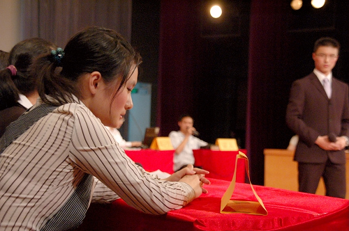 在简要地回顾完法律文化节的各种活动后,便进入了本次活动的重头戏——2009英美法系模拟法庭的庭审阶段,并创造性地随机抽取了12名现场观众组成陪审团。随着法官、书记员及辩控双方先后入座,书记员宣读法庭规则,陪审团成员宣誓完毕,庭审正式开始。