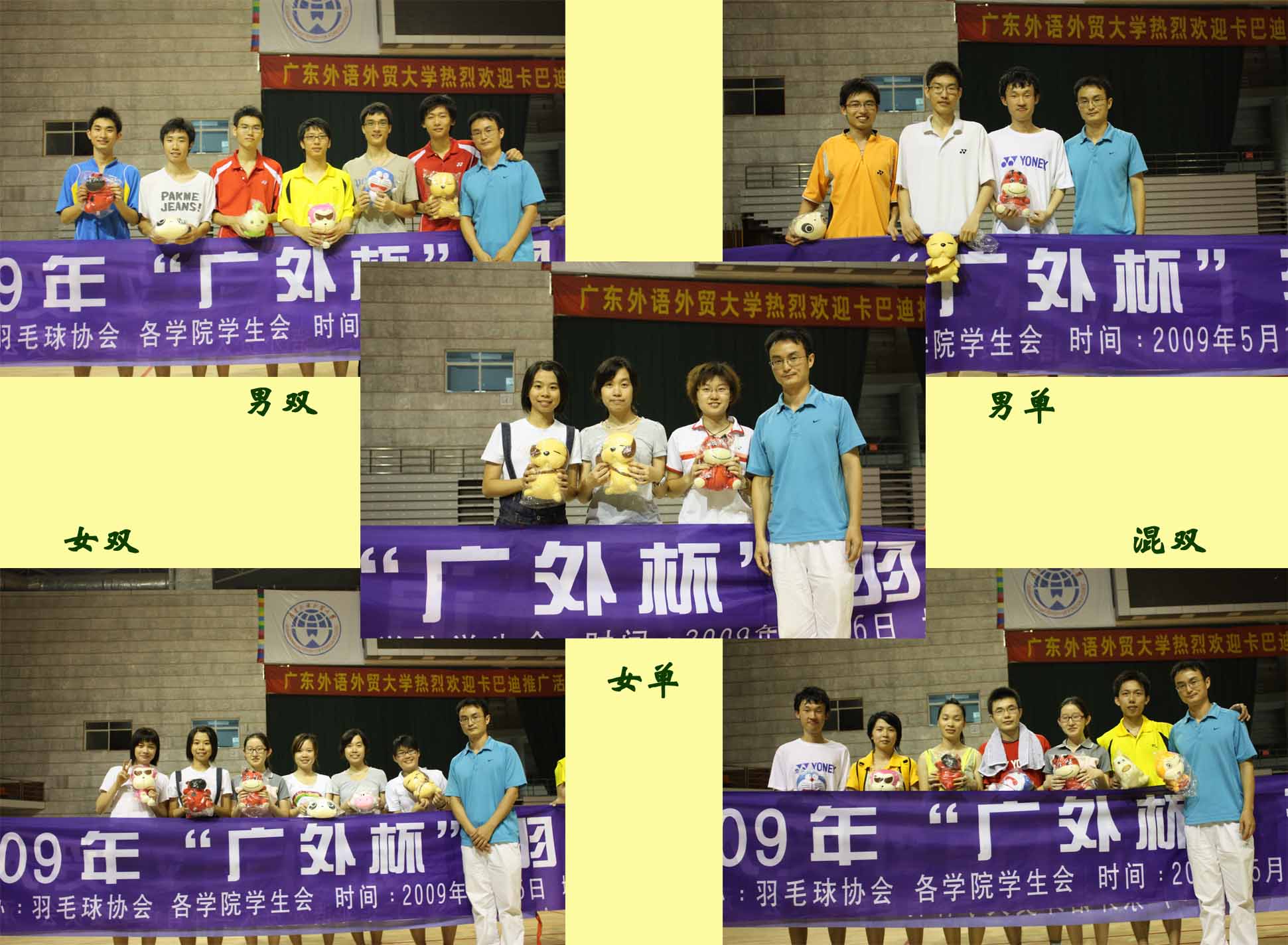 本网讯 5月16日,2009“广外杯”羽毛球赛在南校区体育馆隆重举行。来自南北两校区的413名选手在男单、女单、男双、女双、混双五个项目上展开了激烈的争夺。经过一天的激烈角逐,英文学院的丘伟舜和法学院的蔡轶嘉分别将男单女单金牌收入囊中,而男双、女双和混双的金牌则依次由黄龙、陈嘉健 (信息学院)、蔡轶嘉、涂凤英(法学院)和田佳、黄美宁(公开学院)获得。